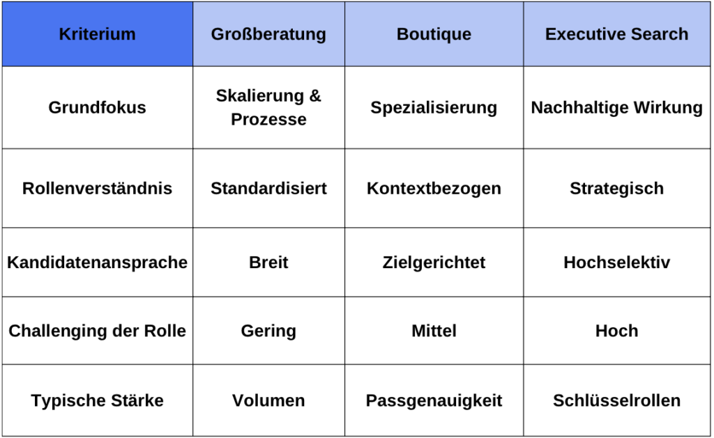 Dieser Artikel soll genau hier Orientierung geben. Er erklärt die Unterschiede zwischen Großberatungen, Boutique-Personalberatungen und Executive-Search-Anbietern, ordnet ihre jeweiligen Stärken realistisch ein und zeigt, wann welcher Ansatz sinnvoll ist – und wann nicht.