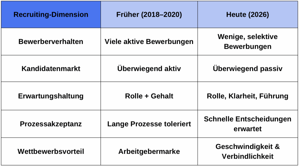 Um diese Verschiebung besser einzuordnen, lohnt sich ein Blick auf die strukturellen Unterschiede zwischen dem Recruiting-Modell der Vergangenheit und der Realität 2026.