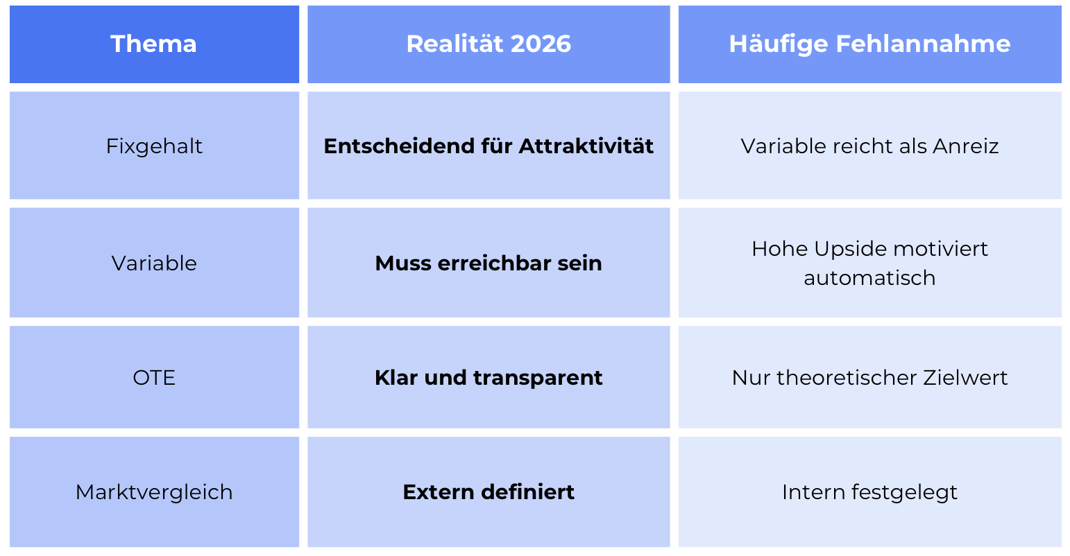 Gerade 2026 wird dieser Unterschied immer wichtiger. Denn gute Sales Manager wählen nicht nur nach Gehalt aus, sie bewerten ob ein Modell logisch, realistisch und erreichbar ist.