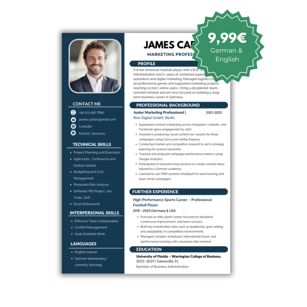 German CVs are typically more structured and results-focused. Recruiters expect clear responsibilities, measurable achievements, and a clean format. Small details can make a big difference in getting interviews. To clarify this point, make sure to check out our blog post where we compare the US-CV vs the German-CV format. Read it here!