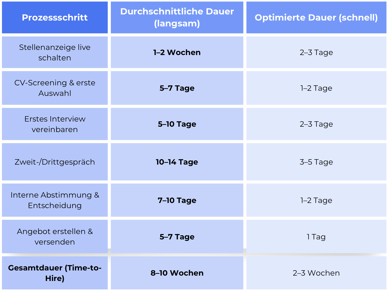 Studien aus dem DACH-Raum zeigen konsistent: Die durchschnittliche Time-to-Hire liegt bei deutschen Unternehmen bei 6 bis 10 Wochen. Schnelle Unternehmen schaffen dieselbe Strecke in 2 bis 3 Wochen. Dieser Unterschied entscheidet darüber, wer die besten Kandidat:innen bekommt, und wer nicht.