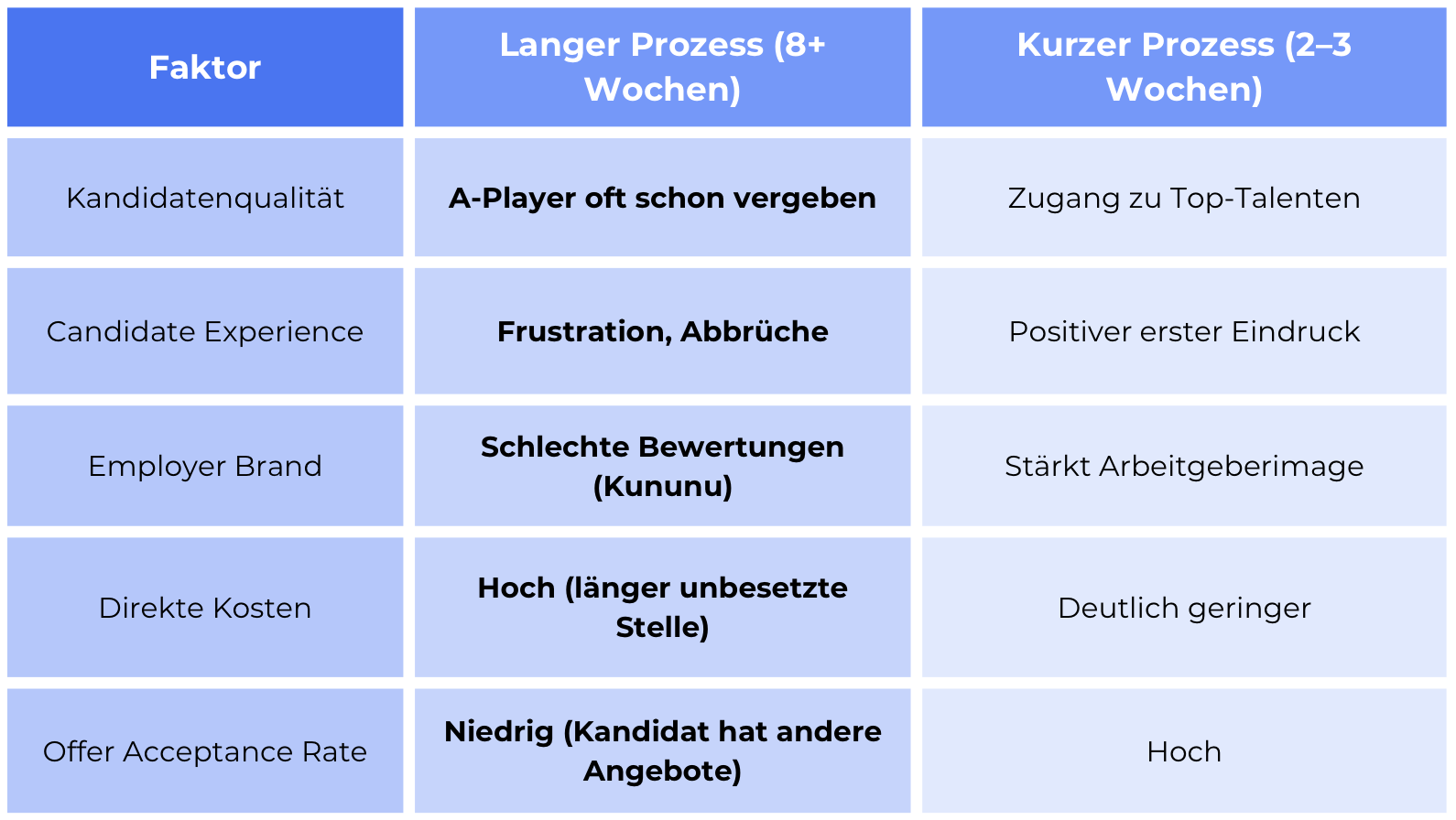 Je länger ein Prozess dauert, desto höher ist die Wahrscheinlichkeit, dass ein Kandidat parallel andere Angebote erhält. Die Offer Acceptance Rate, also der Anteil der Kandidaten, die ein Angebot tatsächlich annehmen, sinkt messbar mit zunehmender Prozesslänge.