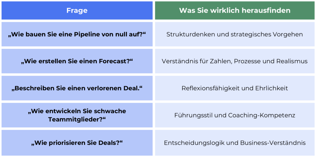 Ein starker Sales Manager kann diese Fragen detailliert beantworten. Ein schwächerer Kandidat bleibt oft vage oder weicht aus.